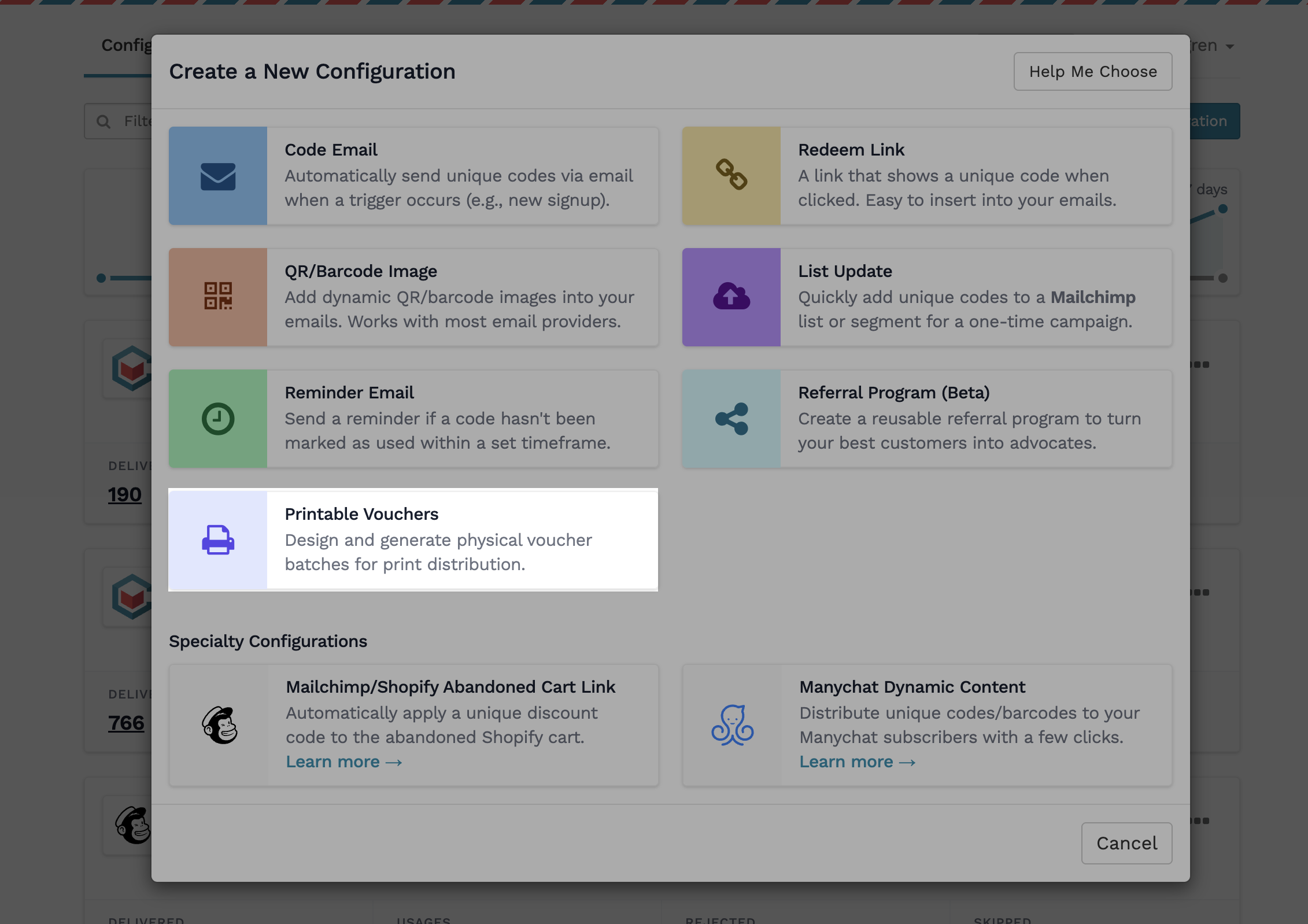 From your main dashboard, click Create a New Configuration. Scroll down and select Printable Vouchers.