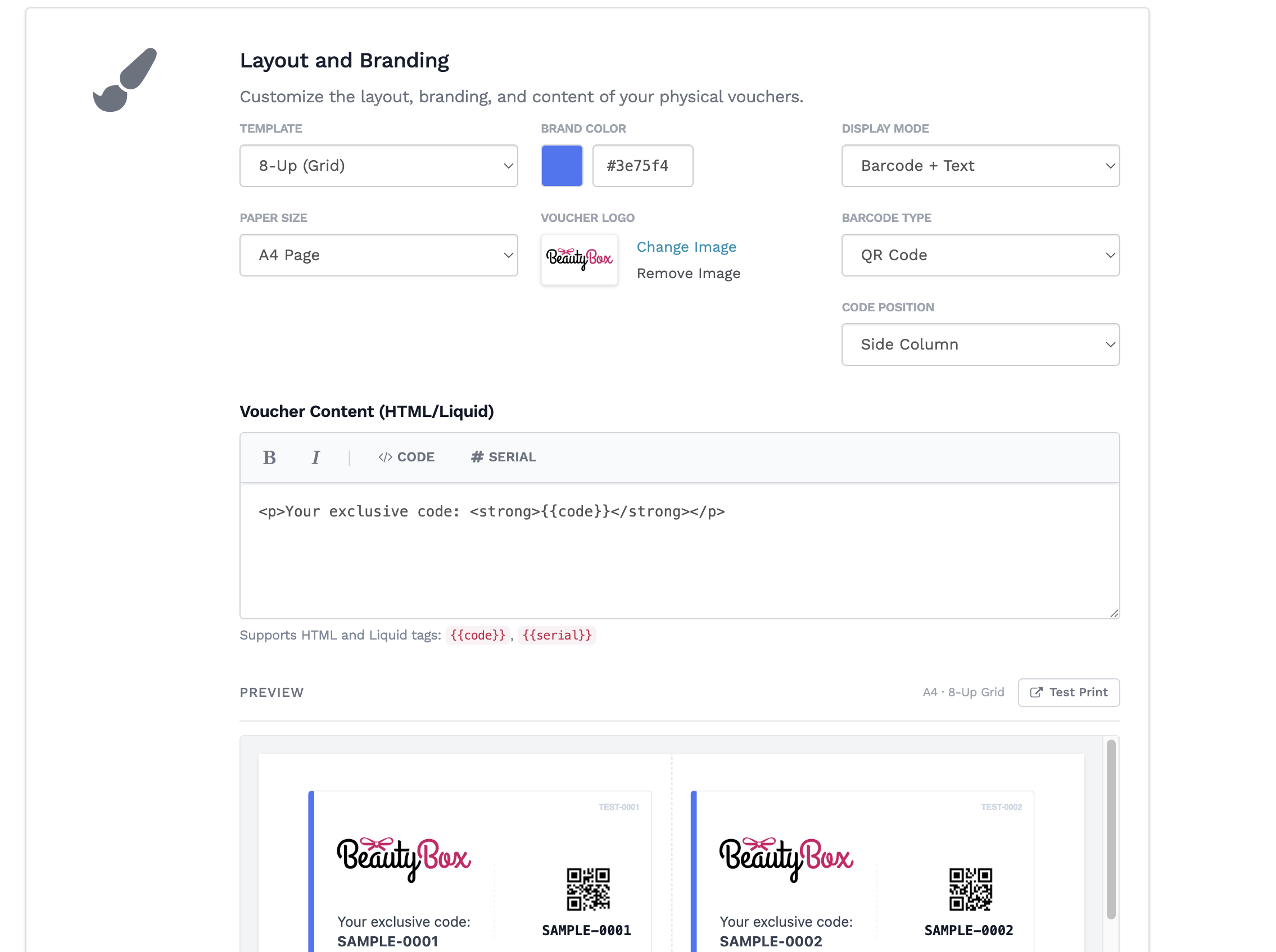 While Coupon Carrier is great for emailing digital codes, sometimes you need something physical. The Printable Vouchers feature lets you generate PDF-ready batches of vouchers, each with a unique, trackable QR code or barcode.