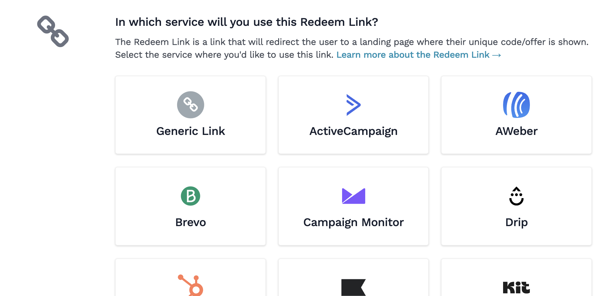 Select the service where the link will be delivered (Mailchimp, ActiveCampaign, Shopify, Zapier, etc.).